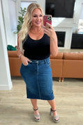 Get ready to rock your denim look with the Marcy High Rise Denim Midi Skirt from Judy Blue! With a flattering high rise fit and a versatile dark wash, this skirt is perfect for any occasion. The 4-way stretch and back vent provide a comfortable and stylish fit, while the raw hem adds a touch of edge. Say goodbye to ill-fitting skirts and hello to the perfect fit!