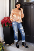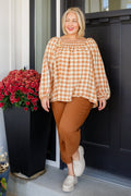 It's easy to look cute and on trend in the One Fine Afternoon Gingham Plaid Top In Caramel! This adorable top features an elasticated gathered square neckline that tops a loose fit bodice and long balloon sleeves with elastic cuffs. Pair with distressed denim and neutral booties for the cutest look!