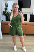 Our Short Sleeve V-Neck Romper features a ribbed V-Neckline, short sleeves, an elastic waistband, and pockets. This army green staple will be the ultimate go-to piece for all your summer adventures. With its lightweight and breathable material, you can enjoy comfort and style all season long.
